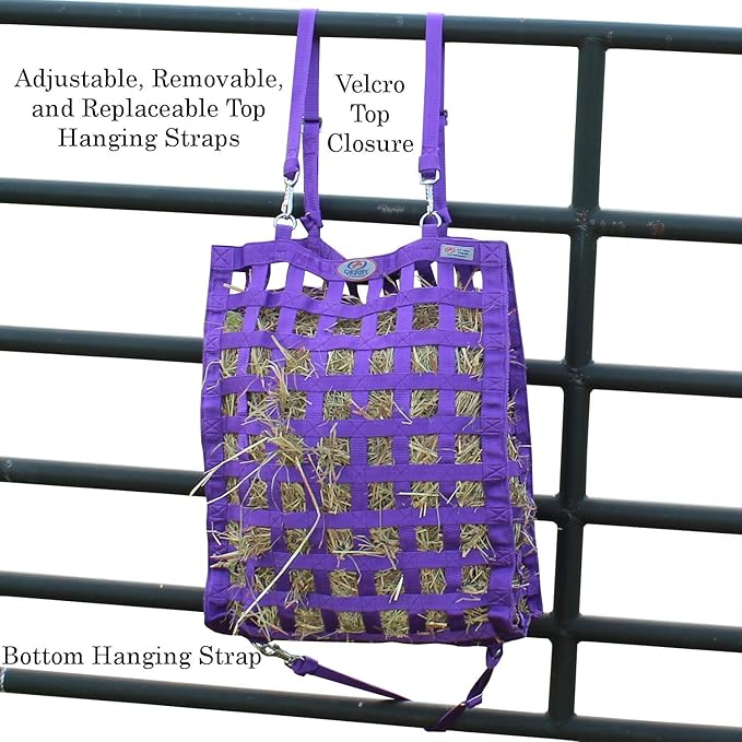 • SUPER TOUGH BOTTOM DESIGN - our exclusive Super Tough Bottom is made of reinforced overlapping nylon webbing. This design allows for superior strength and durability while keeping your hay fresh and allowing dust and debris to exit the bag.