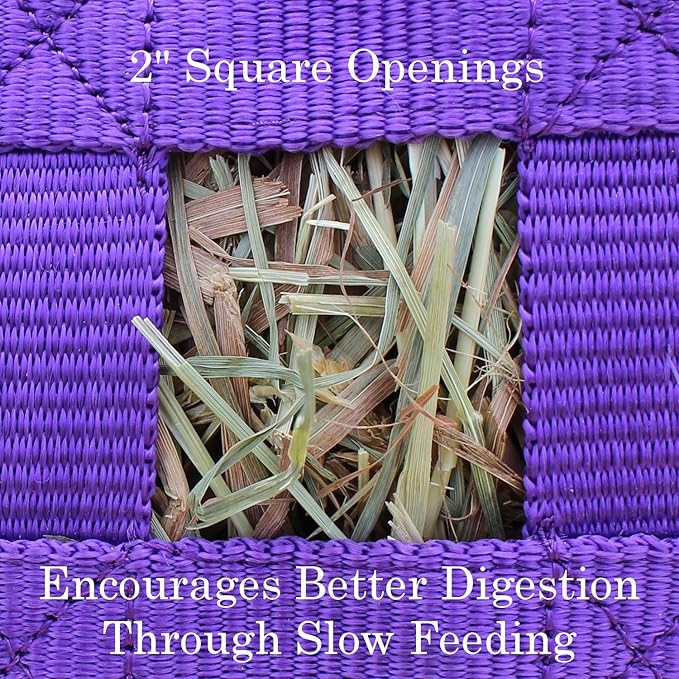 • HOLDS 2-3 FLAKES OF HAY - this 22x8x25" hay bag with 1.75" square openings holds approx. 2-3 flakes of Timothy, Orchard, Alfalfa, or any other type of hay. Our hay bags were designed to minimize frustration and can be stuffed in seconds.