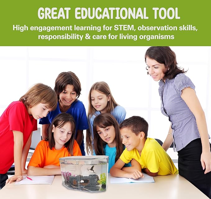 - Educational and Entertaining: Perfect for introducing children to the responsibilities of pet care while fostering a love for nature with this hands-on kit. These fully-aquatic frogs are peaceful, social, and fun to watch as they swim, explore, and interact with their surroundings. Unlike traditional fish, African dwarf frogs have unique behaviors that make them an exciting and engaging pet.