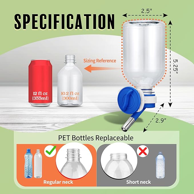 - ๐พ Mini-sized Nozzle (10mm) is perfect for small animals, especially for Hamster/ Hedgehog/ Sugar Glider/ Rat/ Mice. Made of BPA Free Material/ 10.2 oz Capacity.