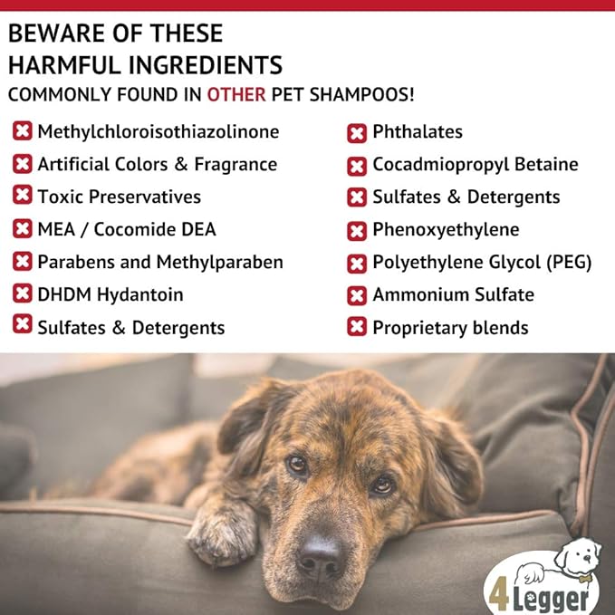 - NATURAL INGREDIENTS THAT MAKE SENSE: 4Legger usda certified organic dog shampoo is a true all natural dog shampoo handcrafted in small batches using real plants, not synthetic chemicals. A dog oatmeal shampoo for dry itchy skin with soothing aloe vera, oatmeal, and lavender essential oil ensures your pup gets clean the right way, without detergents, petrochemicals, or other harmful ingredients commonly found in other dog shampoo. 4-Legger is safe for dogs, cats, and you!