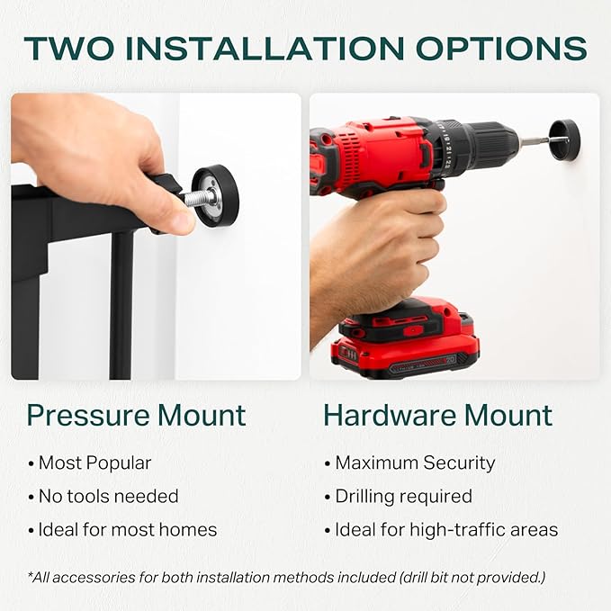 - Two Installation Options: Our gate features two convenient installation options: pressure mounting and hardware installation. Pressure mounting allows for quick installation in just 10 minutes without any tools, providing a secure fit that won't damage walls. It's perfect for hallways and doorways and can withstand impacts of up to 150 Lbs for enhanced safety. Hardware installation offers maximum stability for high-traffic areas like staircases, preventing movement. It can endure impacts exceeding 210 Lbs without sustaining damage, making this gate a reliable choice for various environments.