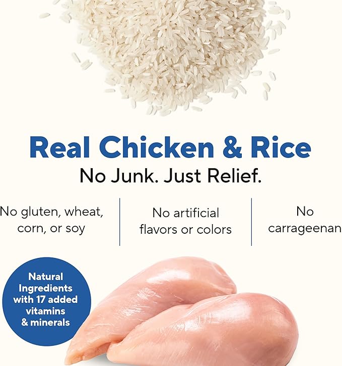 - Simple chicken and rice recipe is formulated to help calm your pup’s tummy during times of transition; also ideal for the dog prone to stomach upset. Great digestive health dog food.