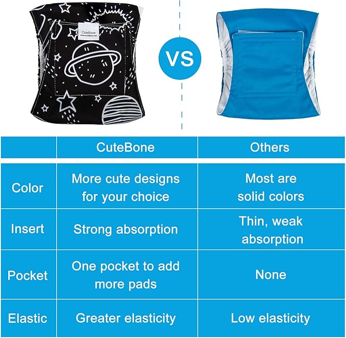 - CuteBone male dog diapers are designed with comfort and durability in mind, they’re perfect for untrained puppies and dog’s incontinent. These soft doggie diapers help your pet keep clean and dry between walks.