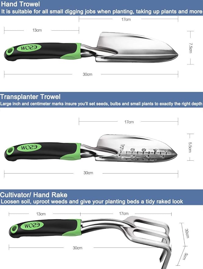 ESOW Garden Tool Set, 3 Piece Cast-Aluminum Heavy Duty Gardening Kit Includes Hand Trowel, Transplant Trowel and Cultivator Hand Rake with Soft Rubberized Non-Slip Ergonomic Handle, Garden Gifts