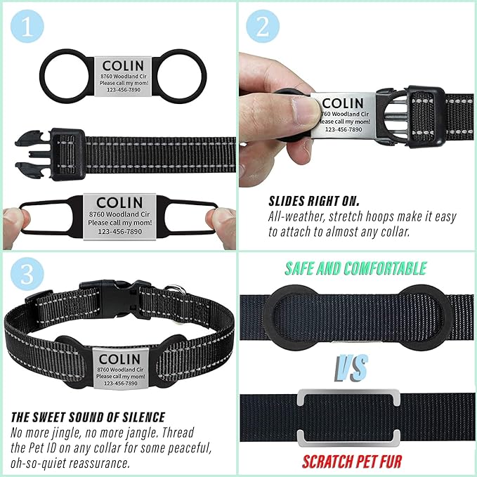 - ๐ถ Silent, Durable, And Lightweight Dog Tags: Made from rustproof stainless steel & silicone, our pet tags for dogs and cats will stand the test of time. The easy, slide-on design makes our pet ID tag silent and ideal for puppies and kittens.