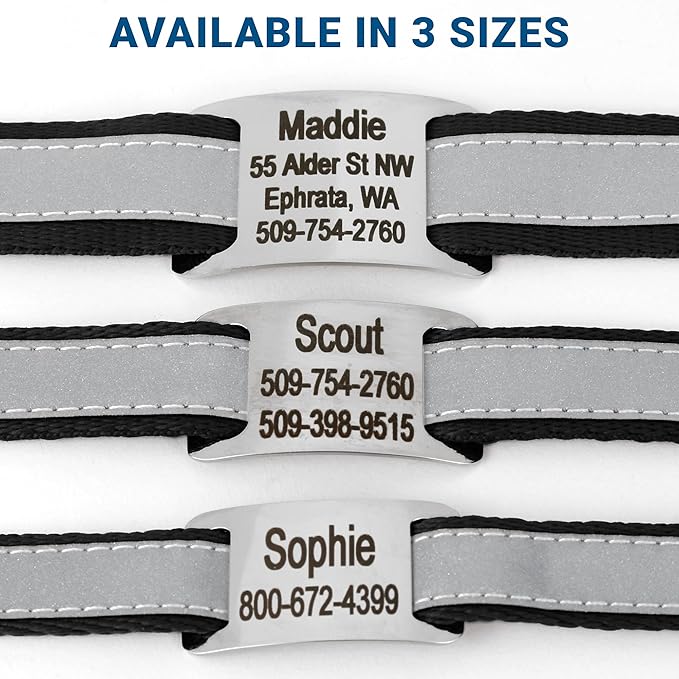 GoTags Reflective Personalized Dog Collar with Nameplate, Adjustable Dog Collar with Custom Engraved Steel Slide On Pet ID Tag, Silent, No Noise Dog Tag for Large Medium or Small (Black, Large)