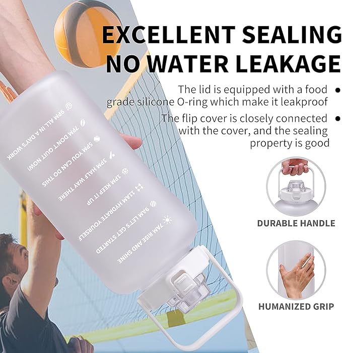 - 💪【Motivational Quote & Time Marker】 With time markers and a unique motivational statement on it, the big gallon water bottle with the tracker is the best choice of reminding you to stay motivated to drink enough water daily. It is important and easy for achieving healthy fitness goals including weight loss, muscle gain, keep hydrated and healthy.