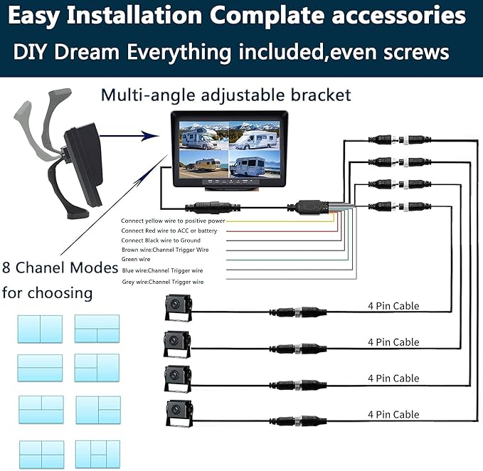 - Best Friend for: RV Truck Trailer Class A Box truck semi truck Travel Trailer Horse Trailer Bus School Bus heavy duty Camper Tractor, the 5th Wheel,Motor homes.Wide voltage power input:12-36V DC Power.HD 1080P Video:1920*1080 Pixel Monitor.4 CCD 1080P Cameras.Extremly HD and stable Image.HD day and night image helps us to observe everything surrounding us,avoid the blind spot.So we can drive with a pleasant mood. Makes our driving 100% safe.