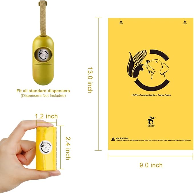 - What You Get: Receive 120 compostable poop bags in one purchase, packaged in 18 rolls with 15 bags per roll. Each bag measures 9 x 13 inches and fits perfectly in standard poop bag dispensers, providing ample space for large dogs and small dogs alike.