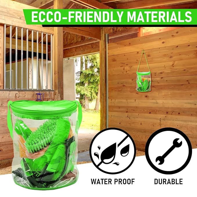 - Product Information: the horse grooming kit, includes a horse grooming tote bag, a oval massage curry, a hard brush, a soft brush, a sweat scraper, bathing sponge, a hoof pick with brush, a mane comb and a tail comb, a total of 9 pieces