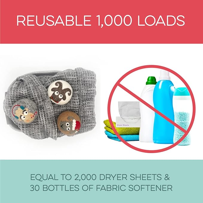 - REUSABLE FOR 1000+ LOADS – REDUCE WASTE: Why keep buying disposable dryer sheets? These cute dryer balls last 1000+ loads, replacing 2000 dryer sheets or 30 bottles of fabric softener. Fluff Ewes dryer wool balls laundry reusable deliver a cost-effective solution for 2-4 years of hassle-free laundry. Make a smarter choice for your wallet and the environment.