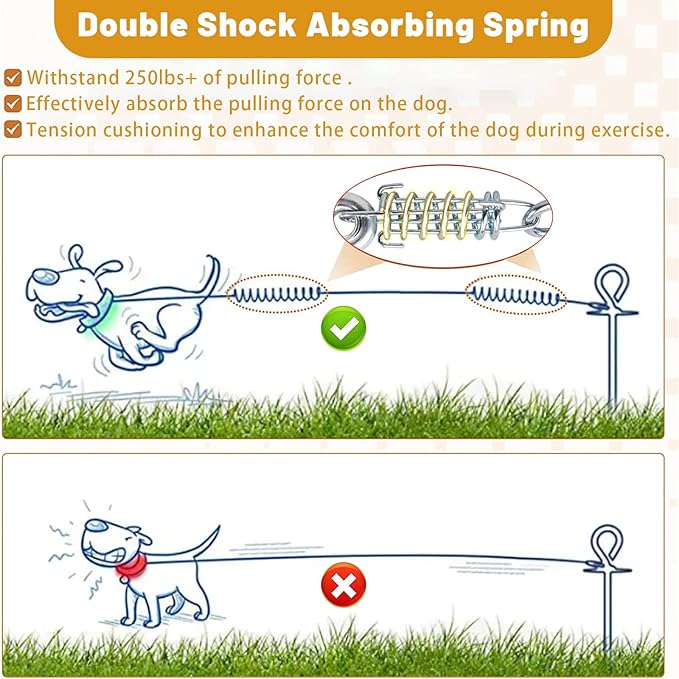 - DOUBLE BUFFER SPRINGS: Buffer springs are provided at both ends of the rope to maximize the protection of dogs. It can buffer the pulling force produced by the dog when running fast, reduce the damage to the dog's neck and body, and give the dog a more comfortable playing environment. provide a more comfortable playing environment for the dog.