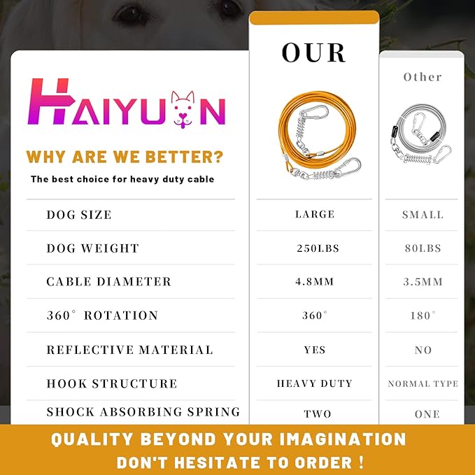 - STURDY DOG TIE OUT CABLE:The HaiYUAN multi-functional, multi-size, ultra-tensile pull cable provides greater range of motion for dogs. Designed for large, medium and small dogs up to 165 lbs.