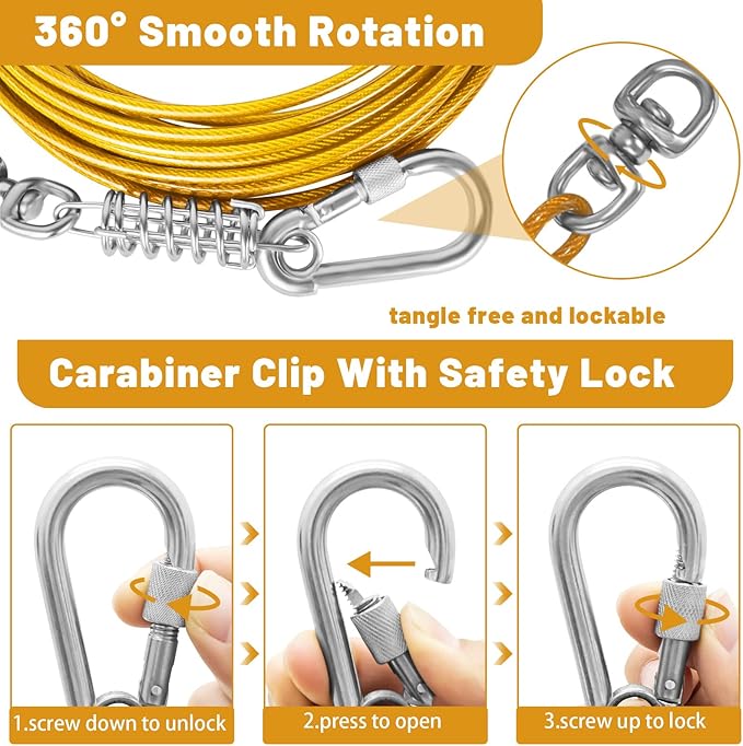 - THE NEWTEST CLIP: The rotating clip can rotate 360 °, and the clip is fixed with a ring at the bottom,so that the dog leash will not fall off the hook easily. Provide more space for dogs to move without entanglement. The screw on the swivel hook can lock it to prevent your pet from escaping from the cable and running to dangerous places. pet from breaking free of the cable and running into harm's way.