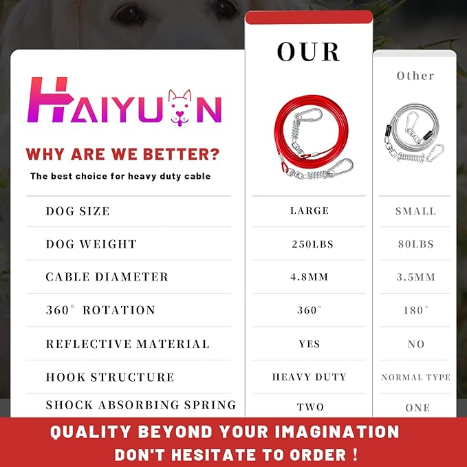 - STURDY DOG TIE OUT CABLE:The HaiYUAN multi-functional, multi-size, ultra-tensile pull cable provides greater range of motion for dogs. Designed for large, medium and small dogs up to 165 lbs.