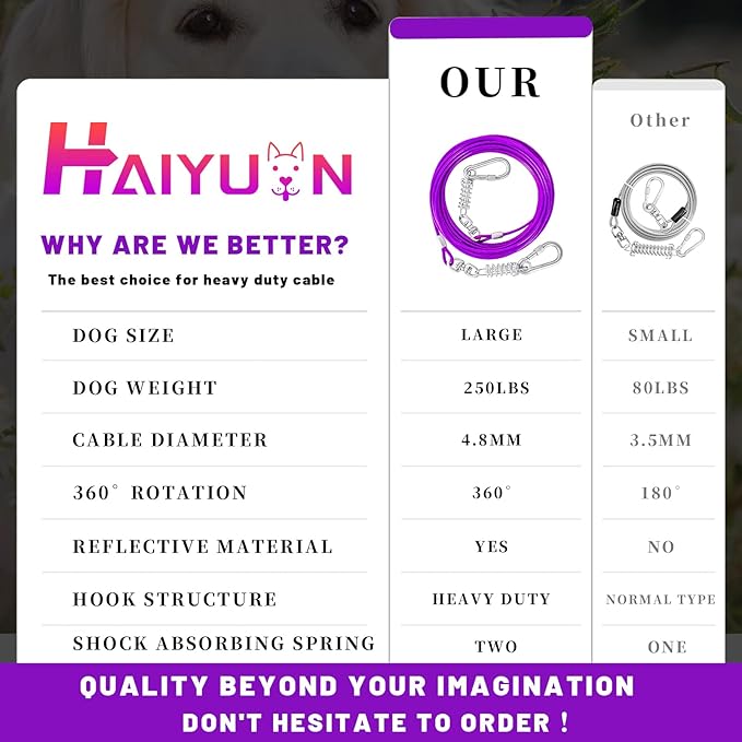 - STURDY DOG TIE OUT CABLE:The HaiYUAN multi-functional, multi-size, ultra-tensile pull cable provides greater range of motion for dogs. Designed for large, medium and small dogs up to 165 lbs.
