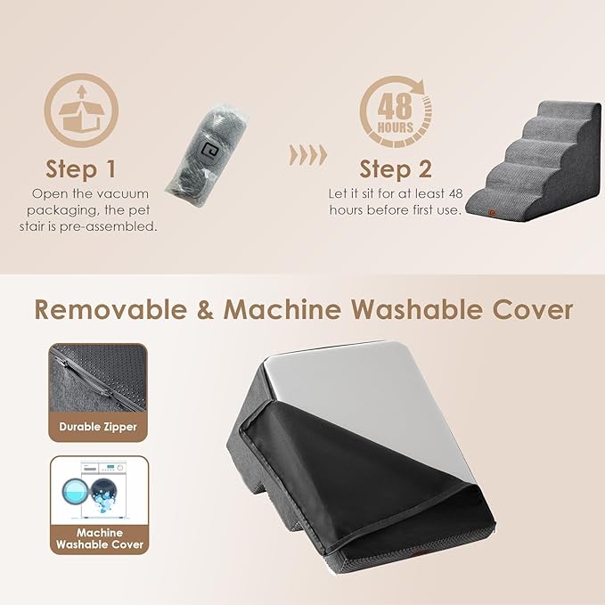 - COMFORTABLE PET STAIRS - This foam dog stair is designed directly against the edge of a bed, sofa or other furniture, so your pet can climb up and down comfortably.