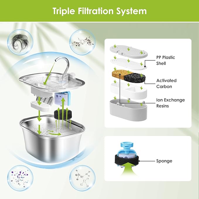 - 🍃【Fresh, Filtered Water】: Every drop of water is filtered through multiple layers. Provide your pets with oxygen-rich water that is more tasty. Pets can drink clean and fresh water all day, which helps to increase water consumption and reduce the risk of urinary tract infections. Making the lives of our beloved pets happier;