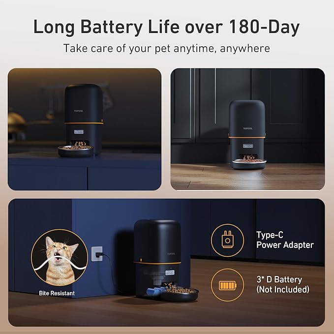 - Dual Power Supply: Our auto pet feeder powered by 3 D-size alkaline batteries (Not Included) can provide more than 180 days of using, allowing you to easily place it anywhere in the room, and you can fully escape from hassle of messy cables. Of course feeder also supports wall power supply, giving you full flexibility and convenience.