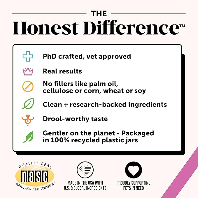 - Manufactured in the U.S.A. | NASC Member Company: All Pet Honesty products are made in the US with US and globally sourced ingredients and are produced in a GMP-compliant facility that meets the highest safety standards, so you can rest assured you're giving your pet the best quality product possible! Pet Honesty is also a NASC member company, meaning it has met the highest quality and compliance standards for pet supplements.