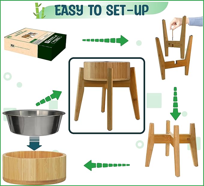 - Hygienic for Both Wet and Dry Dog Food โ Crafted from kitchen-grade natural bamboo and stainless steel materials, this dog food feeder is ideal for your petโs well-being. The steel bowl ensures hassle-free washing and drying.