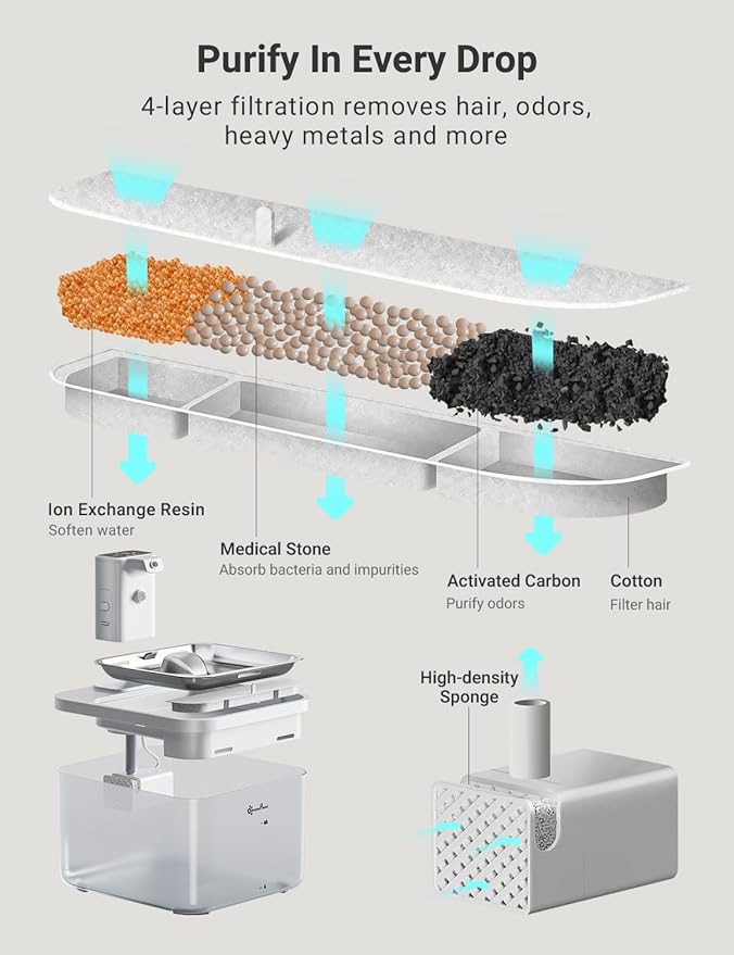 - Enjoy Every Sip of Fresh Water - The 5-level filtration system continuously provides fresh and healthy water to your pets. 1.Activated carbon removes bad taste and odor 2.Ion exchange resin could soften the tap water 3.Medical stone removes heavy metals and releases trace elements 4.Non-woven fabric could filter hair and impurities 5.The high-density sponge of pump helps remove fine particles