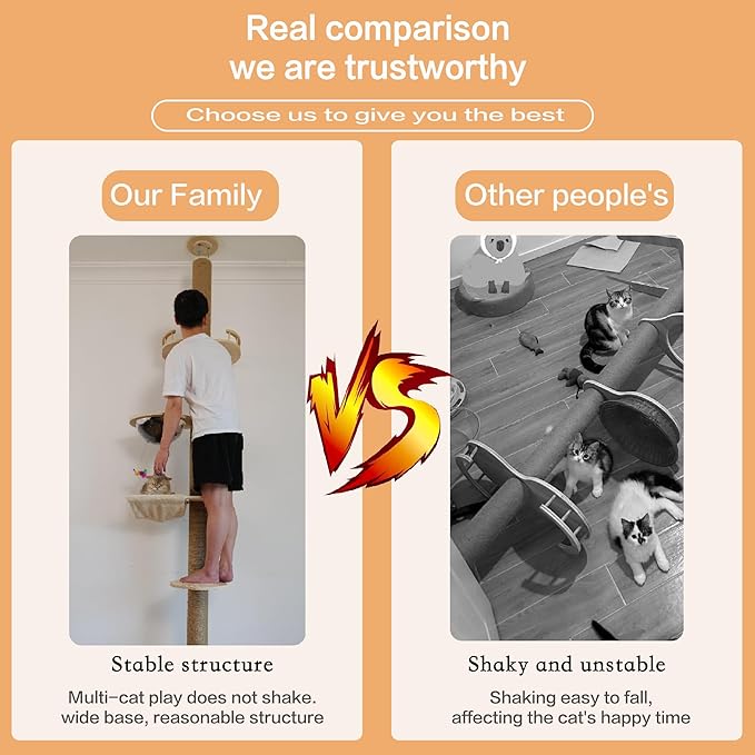- Sturdy Floor-to-Ceiling Cat Tree with Stable Structure The top structure of this heavy-duty floor-to-ceiling cat climber is reinforced with 3 heavy-duty steel screws and paired with a stable base, supporting up to 140 lbs to ensure zero wobble for multi-cat households. The innovative design requires no drilling—simply adjust the height between 55" and 120" to fit standard to extra-tall ceilings, providing a safe climbing experience without damaging walls.