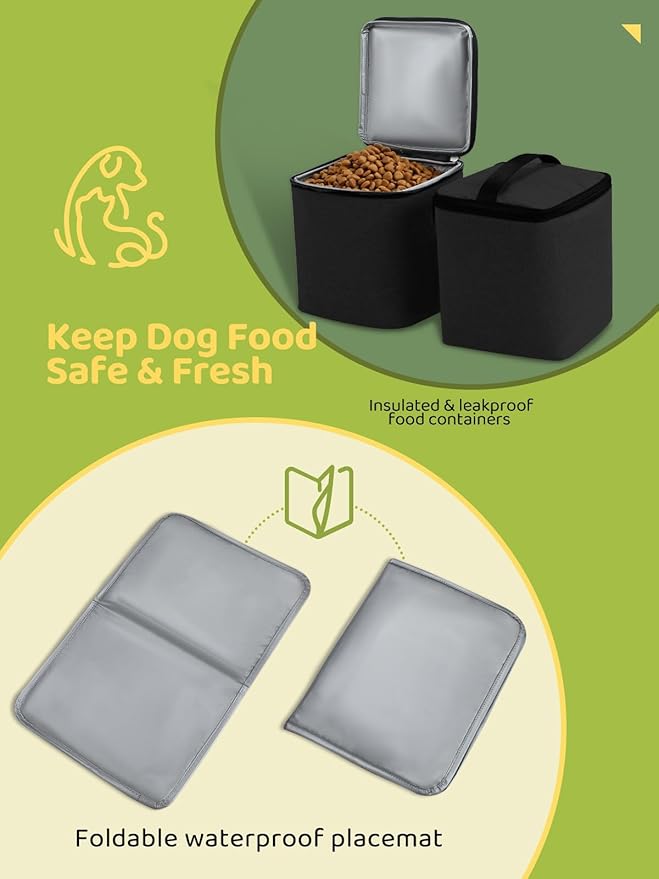 - Make Dog Feeding Easier: Two premium silicone food/water bowls and a waterproof placemat let you feed your pup easily without making a mess. When collapsed, the lightweight silicone bowls with carabiners are easy to stash inside the dog overnight bag, attach to the dog bag exterior, or clip onto your dog’s collar.