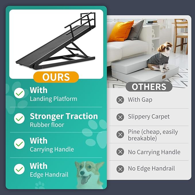 - STURDY & DURABLE: Our pet ramp for dogs and cats is specially made very well - solid wood construction and sturdy stainless steel fasteners, which has been tested to support up to 200lbs. When they jump off the bed, sofa, and sofa, there is no need to worry about getting injured, which provides safety for your pet.