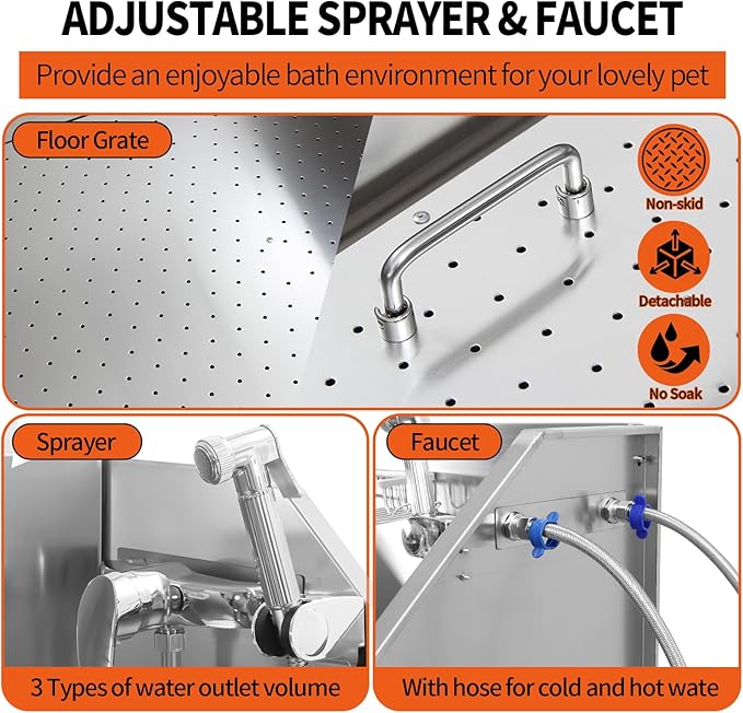 - Dog washing station, measuring 38"x24"x49". Constructed from premium 304 stainless steel, this bathing station embodies durability and corrosion resistance. Its sleek design ensures effortless cleaning, offering not only a pet bathing haven but also a functional daily sink