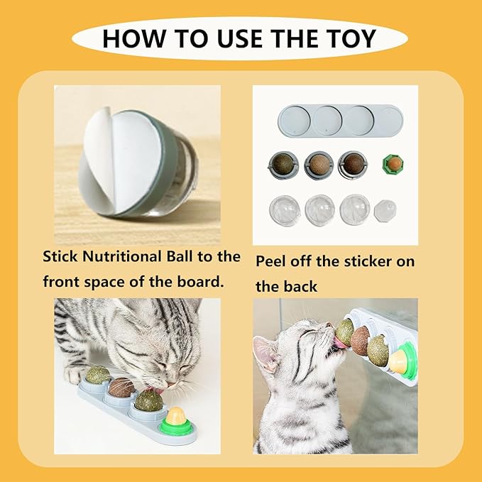 - 【Unique Design】The cat chew ball toy can be easily glued to the wall or other surfaces with good stickiness, and not easy to fall off when your kitten licks and plays. The catnip treat balls can be rotated 360 degree when licking
