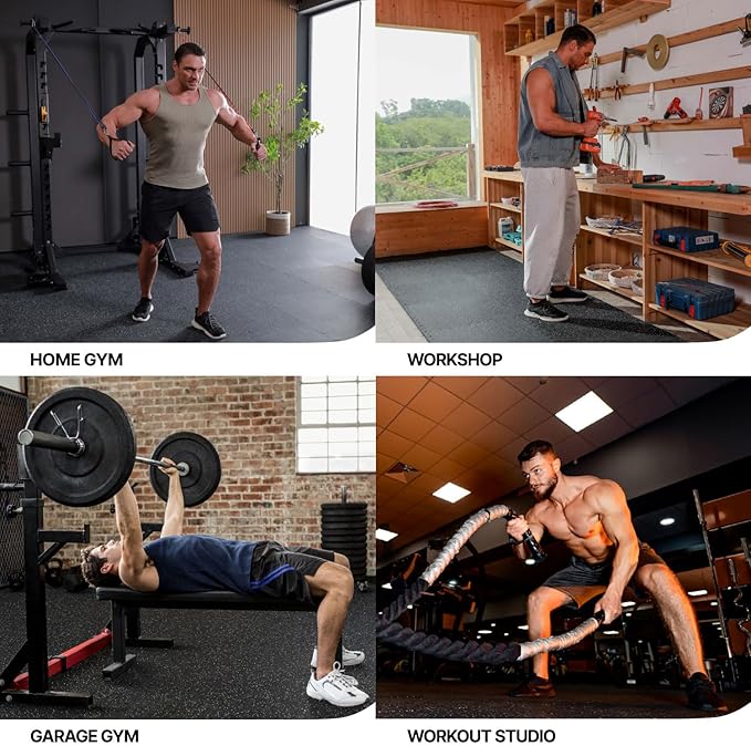 - [Effortless to Maintain]: Crafted from High-Density EVA Foam, these tiles minimize noise and vibration, allowing quiet and comfortable workouts. The waterproof feature makes cleaning a breeze with a damp cloth. Ideal for yoga, benches, workouts, treadmills, crossfit, kettlebells, cardio, and more.