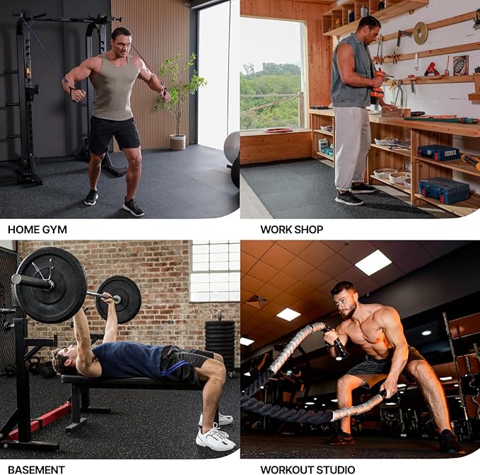 - [Sturdy Rubber Build]: Crafted from premium recycled rubber, our gym mats handle intense workouts with ease. These resilient tiles effortlessly support heavy machinery, providing reliable floor protection against scratches, scuffs, and dents from weights, dumbbells, medicine balls, jump ropes, and other workout gear in a home gym.