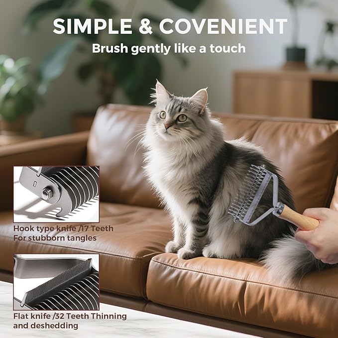 - DOUBLE SIDED DESIGN Our detangling comb with 2 sides (wood + metal) is designed with two sides to effectively detangle and remove carpets and knots from your pets coat. The solid wood handle is perfect for daily grooming and maintenance, while the metal side is ideal for tackling carpets and hard knots