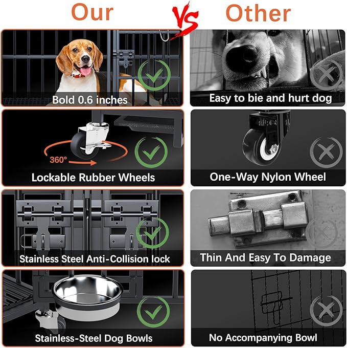 - 【Practical & Easy to Move and Clean】The dog crate comes with four smooth rolling locking wheels for easy movement and fixation, you can easily move the crate to different positions as needed. The dog crate comes with two pull-out tray for easy removal and cleaning. It also comes with a safety latch to avoid your smart dog from opening the iron door, effectively protect your pet.