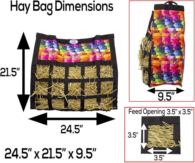 - HOLDS 2-3 FLAKES OF HAY - this 24.5"x9.5"x21.5โ hay bag with 3.5" square openings holds approx. 2-3 flakes of Timothy, Orchard, Alfalfa, or any other type of hay. Our hay bags were designed to minimize frustration and can be stuffed in seconds.