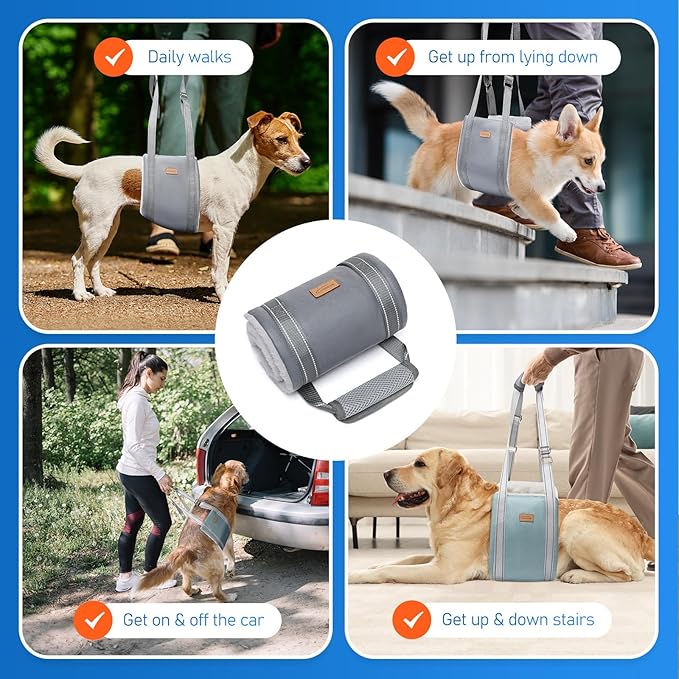 - SUPPORT HIP SLING - Our Dog Lift Harness is a reliable and effective solution for elderly dogs, orthopedic injuries, or any other debilitating ailments. Help your beloved pet regain mobility and independence with our innovative dog sling