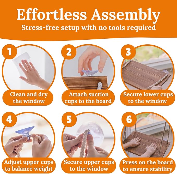 - Easy Assembly: With simple instructions, window cat bed can be set up in minutes without any tools, but remember to clean both the window and suction cups for optimal grip. Apply some pressure and readjust the cups if needed for maximum stability and safety.