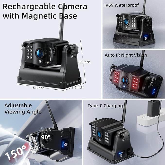 - 1-Min DIY Installation : With a strong magnetic base and buit-in battery, this wireless backup camera can effortlessly adhere to any metallic surface without the need for drilling holes or routing wires on your vehicle. It offers true plug-and-play functionality, allowing for installation in just one minute. The magnetic base and battery design also facilitate convenient removal and reinstallation of the wireless reverse camera on alternative vehicles or locations.