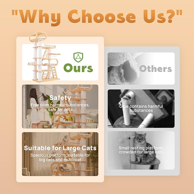 - Natural Pine Wood: KZLAA Tall Cat Tower weighs approximately 149 pounds and is made of natural pine wood and natural sisal, safe materials with no odor and will not cause harm to people and pets.