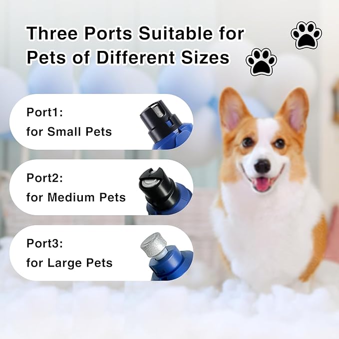 - Quiet Nail Grinder for Dogs: 2 rotation speed settings and 3 grinding ports are suitable for pets of different breeds and sizes. You can choose the appropriate port to trim dog nails of different thicknesses and lengths. The noise level of the electric dog nail trimmer is maintained at around 40 decibels, allowing your pet to enjoy a quiet dog nail grinder
