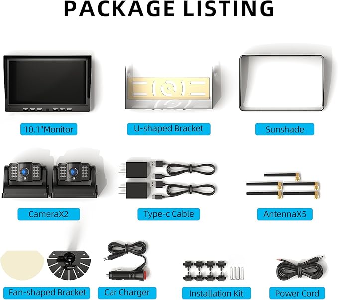 - 10.1" IPS Monitor & IR Night Vision:With high resolution of 1080 pixels, the larger monitor gives us broader and clearer image, the cameras offers a 150° wider view, so that we can drive with a pleasant mood