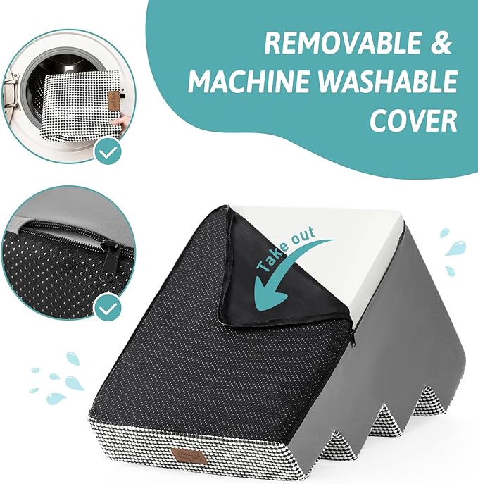 - Non-Slip Base and Removable Cover: Our dog steps for beds are equipped with a non-slip base featuring rubber dots for extra grip, minimizing movement during use. The pet steps cover is waterproof inner side, so you don’t have to worry about stains seeping into the foam. The outer cover is removable and machine washable for easy cleaning