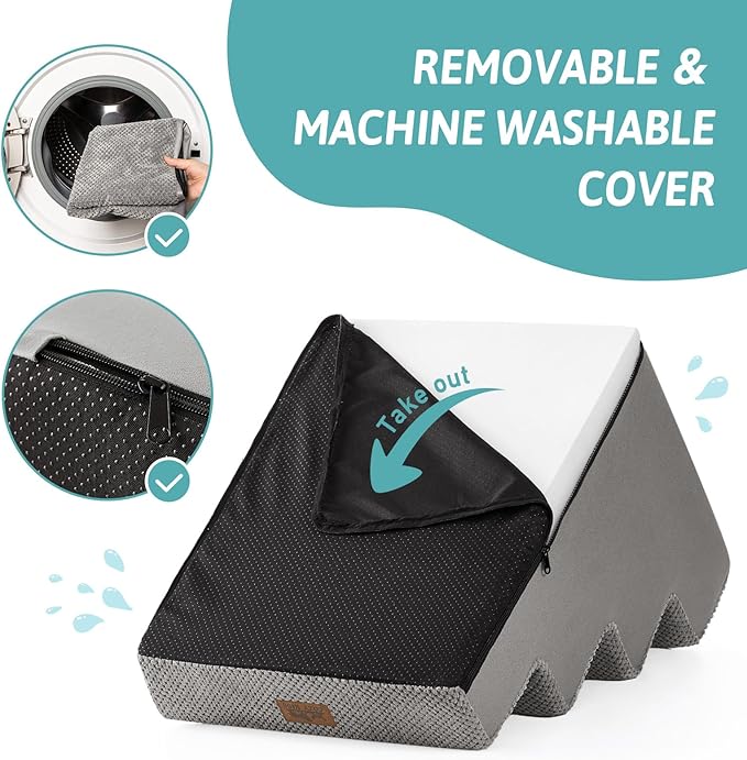 - Non-Slip Base and Removable Cover: Our dog steps for beds are equipped with a non-slip base featuring rubber dots for extra grip, minimizing movement during use. The pet steps cover is waterproof inner side, so you don’t have to worry about stains seeping into the foam. The outer cover is removable and machine washable for easy cleaning