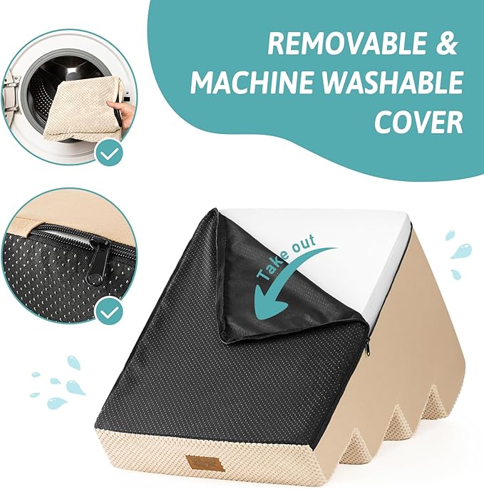 - Non-Slip Base and Removable Cover: Our dog steps for beds are equipped with a non-slip base featuring rubber dots for extra grip, minimizing movement during use. The pet steps cover is waterproof inner side, so you donโt have to worry about stains seeping into the foam. The outer cover is removable and machine washable for easy cleaning