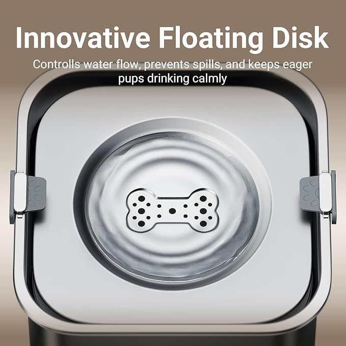 - Floating Disk Design: Controlled Water Flow for a Spill-Free Experience. The advanced floating disk design ensures a steady water flow, allowing your dog to drink easily without splashing.And keeping your dog's muzzle and fur dry while drinking. It prevents spills, keeps your floors dry, and creates a cleaner, more enjoyable environment.