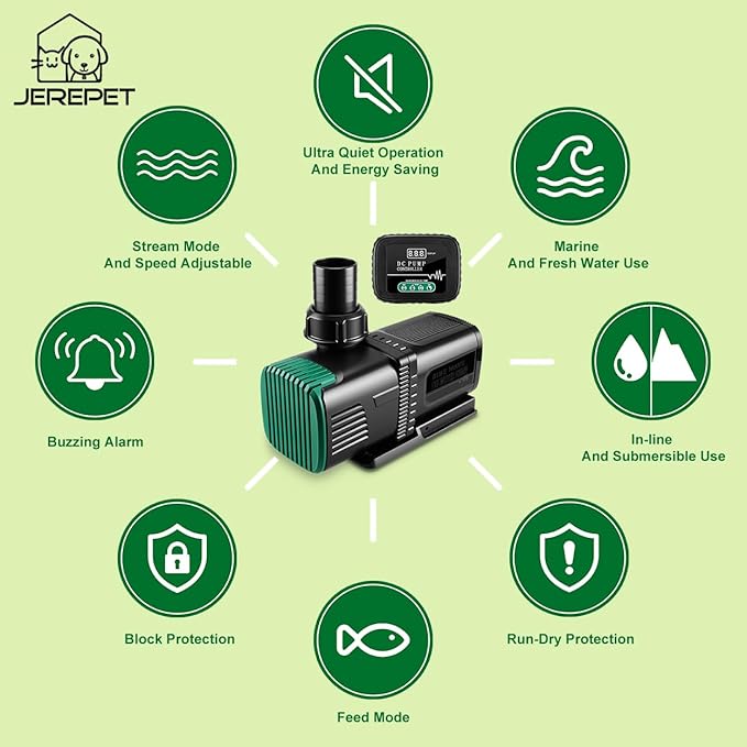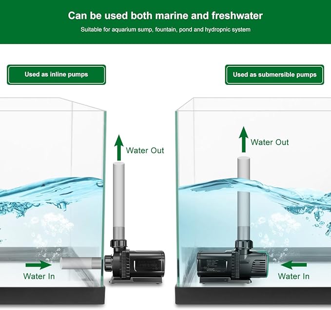 - Wide applicaion DC pump: can be used as salt water or fresh water aquarium sump pump, fountain pump,hydroponics pump and waterfall pump;can be used as external/inline or sumbersible pump;