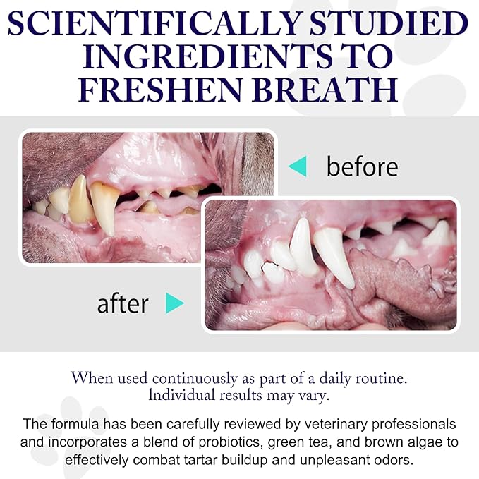 - Pet Breath Freshener - Improper oral care can lead to bad breath and dental issues in dogs and cats of any age. Our specially formulated powder helps reduce plaque and tartar buildup over time, ensuring fresher breath and healthier teeth for your feline friend.