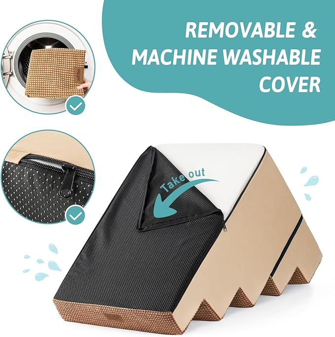 - Non-Slip Base and Removable Cover: Our dog steps for beds are equipped with a non-slip base featuring rubber dots for extra grip, minimizing movement during use. The pet steps cover is waterproof on the inner side, so you don’t have to worry about stains seeping into the foam. The outer cover is removable and machine washable for easy cleaning